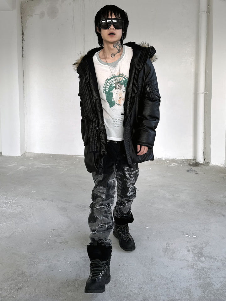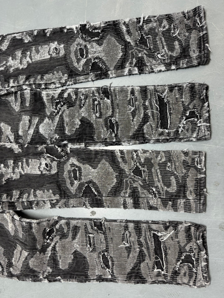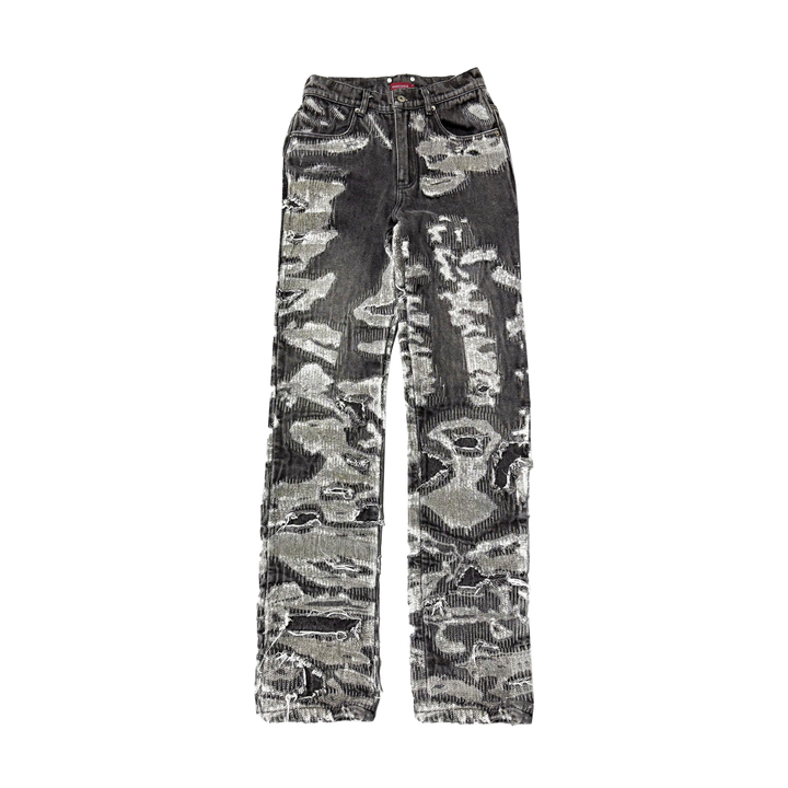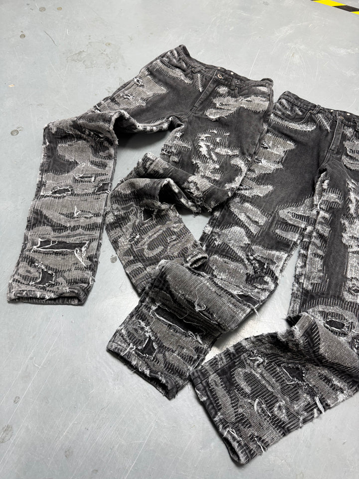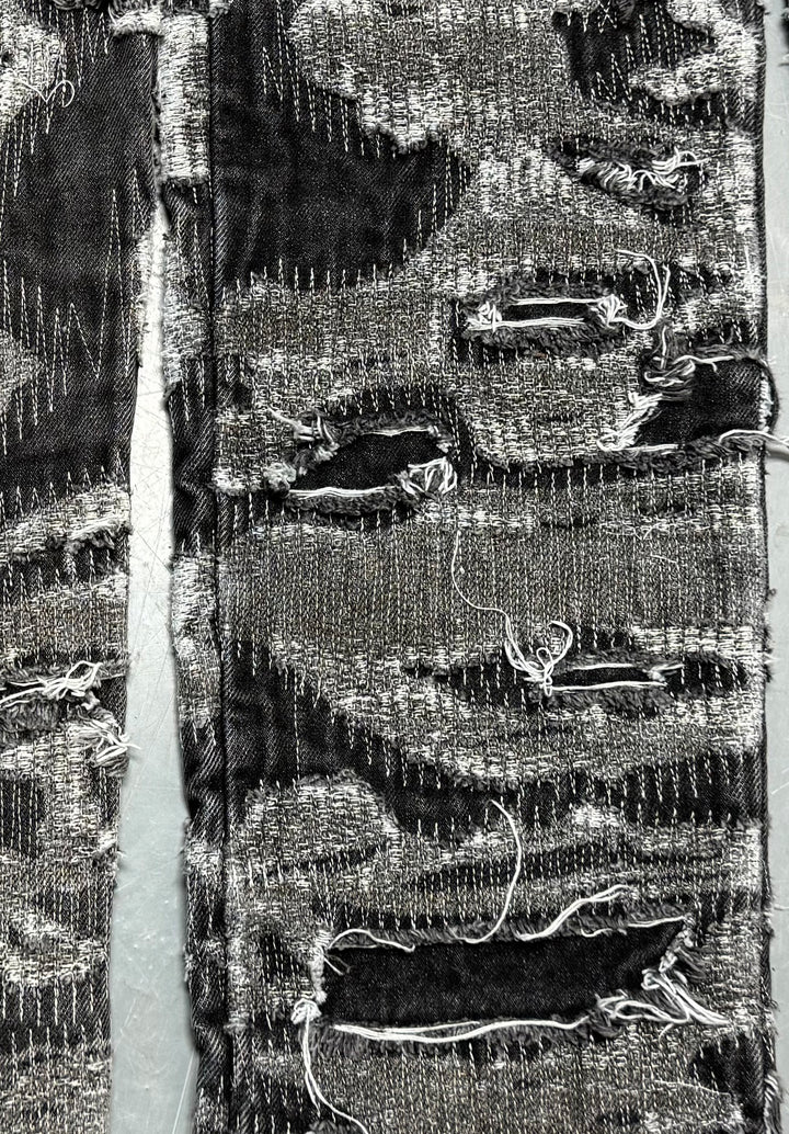 HEAVILY DISTRESSED AND REPAIRED STONE WASHED DENIM